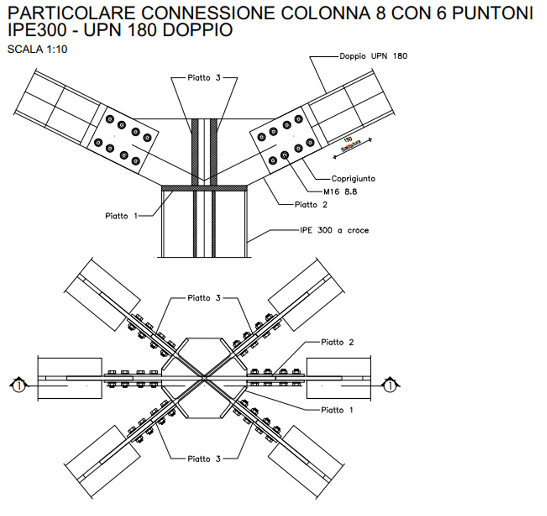 L’edificio adibito a mercato è progettato come una pensilina in acciaio su fondazione a platea. La struttura ha pianta simmetrica su entrambi i lati ed è caratterizzata dalla presenza di 13 pilastri a croce austriaca, ognuno dei quali sorregge 4 puntoni a piramide rovescia su cui si innestano le travi piane di copertura e i controventi di solaio. L’edificio è situato su terreno in pendenza, pertanto la sistemazione del terreno per la posa della fondazione prevede una porzione di sterro e una porzione di rinterro. A quota +1,33m dall’estradosso di fondazione vi è la soletta di piano terra posta alla quota della piazza che collega il mercato alla Struttura A. A quota della soletta è presente un blocco a pianta quadrata di lati 6mx4m circa composto da muratura portante su setti in calcestruzzo. L’intera platea è chiusa perimetralmente sui bordi da setti in calcestruzzo armato che collegano la platea alla soletta.